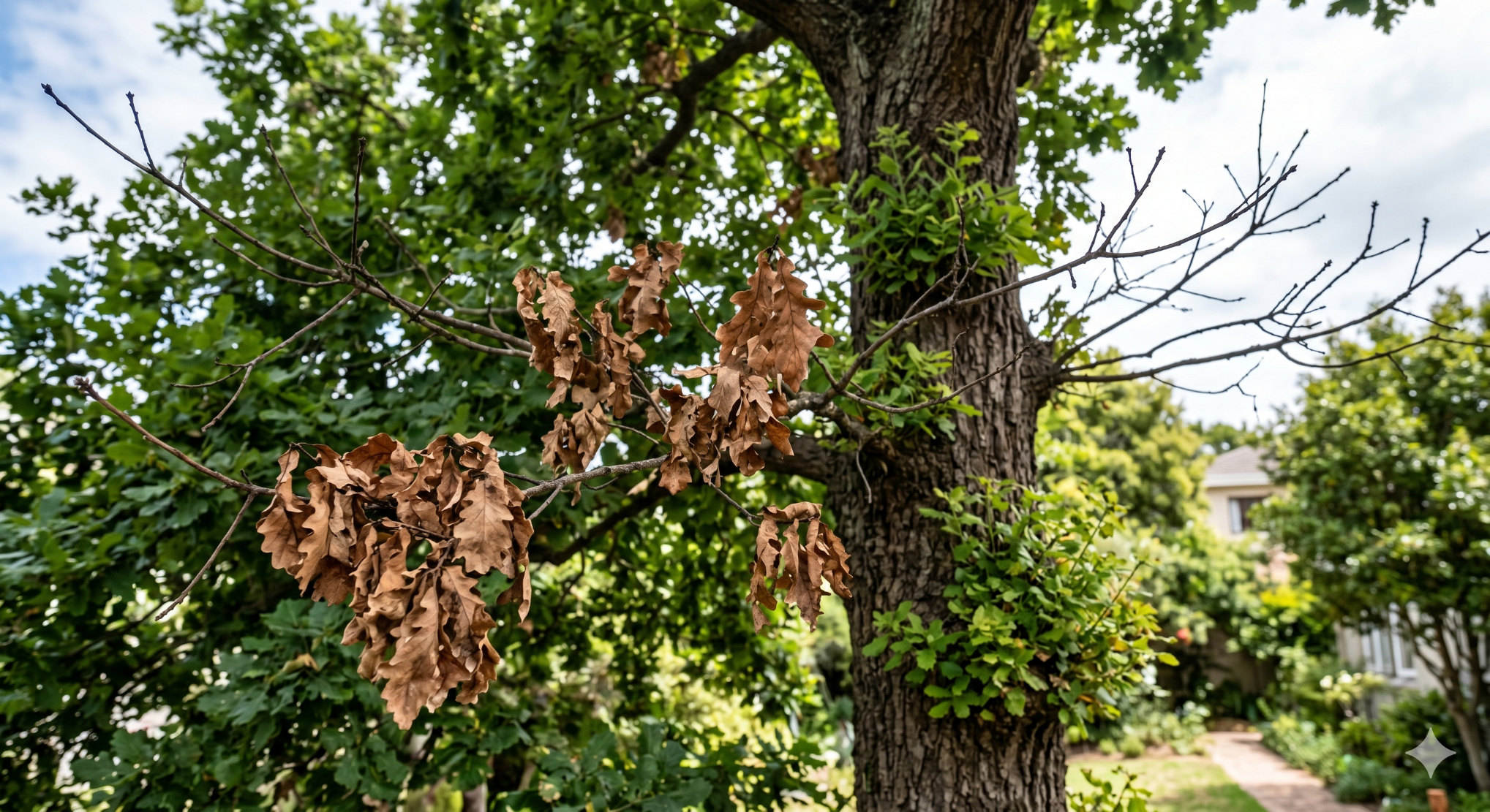 Stress Epicormic Growth: As the canopy dies, the oak may desperately sprout tiny, bushy clusters of leaves directly from the main trunk. These "epicormic shoots" are the tree’s last-ditch effort to create energy.
